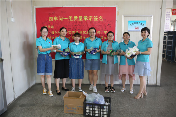 7月,际华3513公司集中为一线职工发放防暑降温用品,对广大职工在炎炎夏日为企业发展做出的贡献表示感谢和慰问;8月1日,工会主席张亚军一行来到生产车间看望、慰问坚守在高温一线的企业职工,将工会集中采购的绿豆、白砂糖、酸梅粉和花露水等防暑物资分发到一线职工手中,感谢他们冒着酷暑辛勤工作,叮嘱他们要保重身体、注意防暑降温;各生产车间保障空调和风扇设备的正常运行,并在每天中午熬制绿豆水供职工解渴、降暑,为职工营造清凉舒适的工作环境。在公司的关怀下,广大职工发扬“特别能战斗、特别能奉献、特别顾大局”的精神,坚守岗位、精益生产,将夏日的热情转化为工作的激情与动力,保质保量的完成上级下达的各项任务指标。